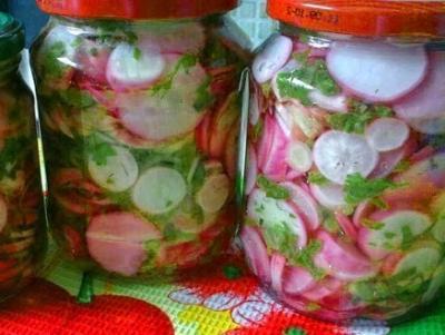 Corte el rábano en círculos, agregue ajo picado y verduras finamente picadas. La mezcla de verduras se coloca en frascos pequeños preesterilizados y se vierte con salmuera preparada con la adición de cilantro. Los bancos se enrollan firmemente y se colocan en un lugar oscuro y fresco.