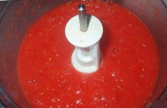 - Limpiamos pimientos morrones. Retirar los tallos y las semillas, cortar en rodajas y pasar por una batidora. Cortar los tomates en 4 trozos y añadir al picar los pimientos. Entonces la masa resultará más tierna. No saque toda la velocidad indicada en la receta de una vez, de lo contrario quedarán trozos intactos.