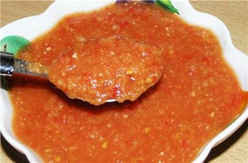 - Tritúralos en una licuadora. Cuando haya pasado una hora y media, vierte las verduras picadas en la masa total. Puede experimentar con pimienta y ajo, cambiando la cantidad y el sabor de la adjika terminada para el invierno.