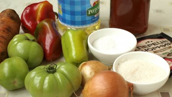 Si el lecho de tomate verde se cuece por más de una hora y media, entonces el aperitivo de pimiento y tomate toma solo 45 minutos. Dado que el tratamiento térmico es mínimo, muchas sustancias útiles se retienen en el plato terminado.