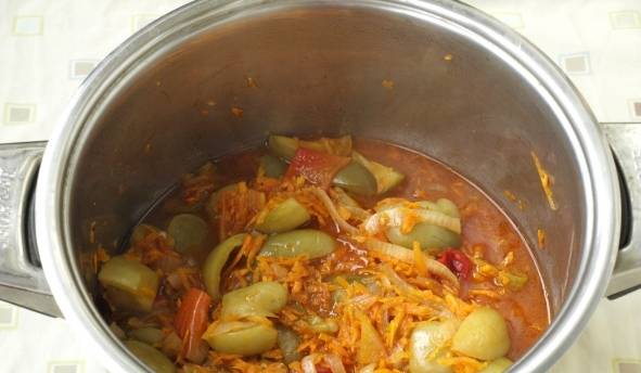 - Poner las verduras en una cacerola con mantequilla, añadir la salsa de tomate y cocinar durante 1,5 horas sin dejar de remover para que el contenido de la sartén no se queme. Cocine tapado a fuego medio.