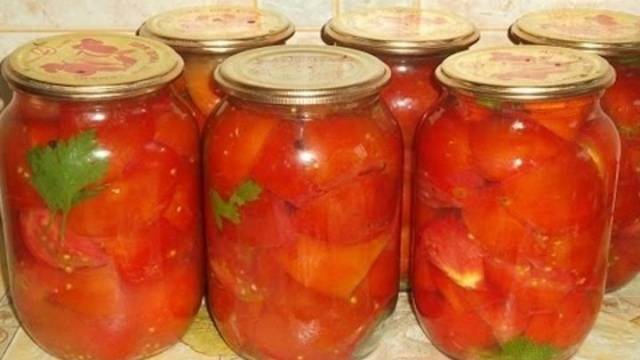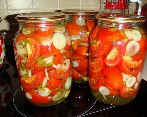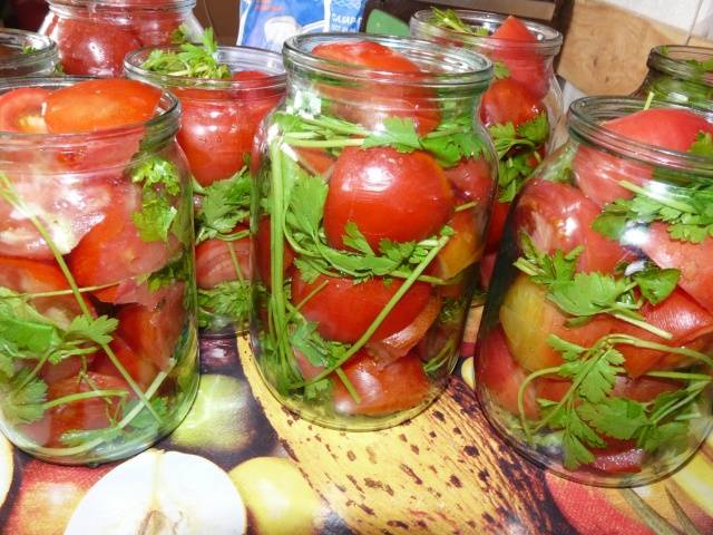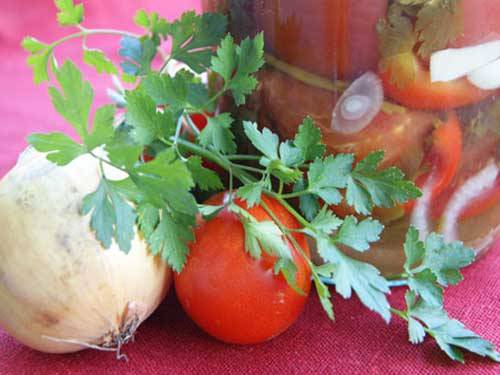 Para las preparaciones de invierno, puede cocinar tomates de acuerdo con una receta diferente, para lo cual, además de los tomates, necesitará: cebollas, ajo, pimientos y, por supuesto, perejil. El adobo para verter se prepara de la siguiente manera: agregue 2 cucharadas por litro de agua. cucharadas de aceite vegetal refinado, azúcar y sal.