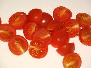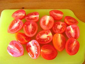 - Corta los tomates en mitades o cuartos, según su tamaño.