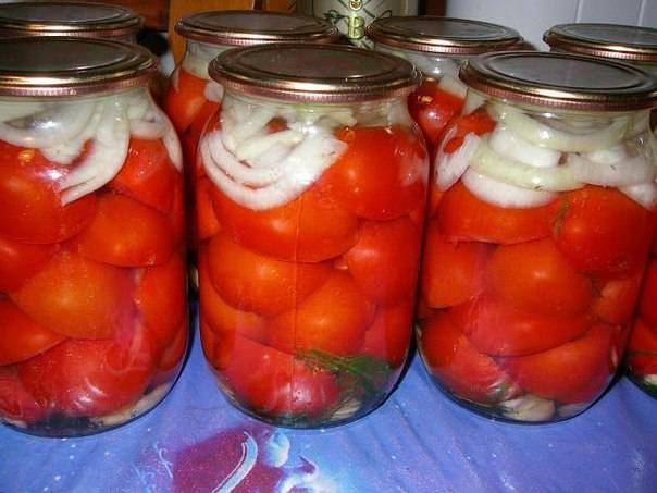 - ponga especias en cada frasco y llénelo con mitades de tomates, mezclados con cebollas. Los tomates deben apilarse cortados.