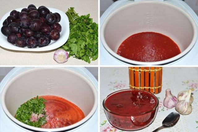 - Ponemos todos los ingredientes preparados en una multicocina, después de lo cual trituramos el contenido con una licuadora. Si tiene miedo de dañar el tazón, corte las ciruelas con hierbas y ajo en un recipiente aparte.