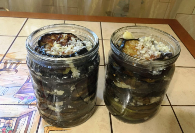 Para cerrar las berenjenas al estilo georgiano para el invierno, los frascos están llenos de aperitivos preparados. Los recipientes se colocan en un horno precalentado a 150 grados durante 7-10 minutos. Luego se retiran las latas, se enrollan con tapas de hierro y se dejan enfriar debajo de una manta.