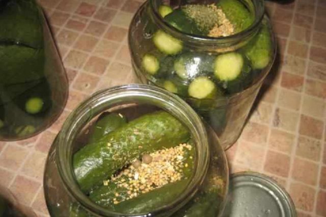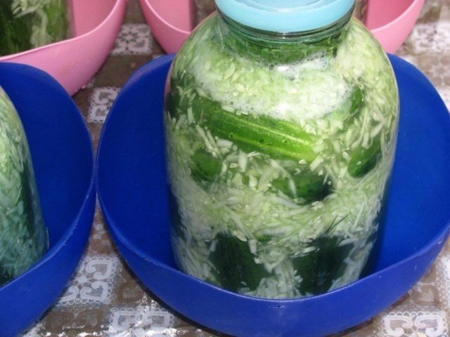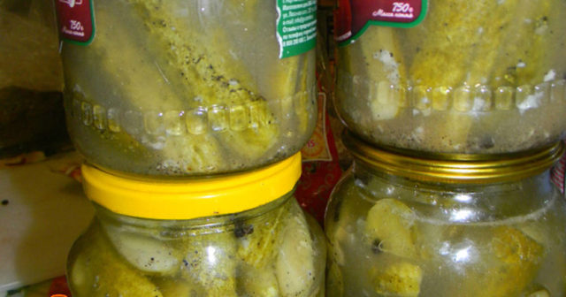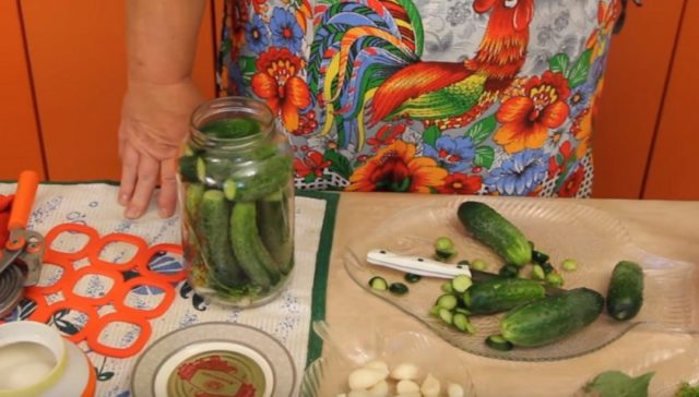 Los pepinos que han abandonado el líquido se colocan en frascos. Se vierten con su propio jugo junto con las especias disueltas en él. Los bancos se esterilizan en agua hirviendo durante 5 a 10 minutos, luego se sellan herméticamente y se envían para su almacenamiento hasta el invierno.