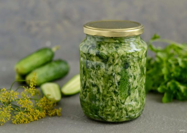 Rallar la mitad de los pepinos en un rallador fino. La otra parte se coloca en un recipiente de 3 litros junto con el eneldo, el ajo y la raíz de rábano picante rallada.La masa de pepino resultante se mezcla con sal y también se coloca en un frasco. Dado que el volumen de líquido en el frasco es bastante significativo, es necesario mezclar bien los pepinos para que estén todos cubiertos con su propio jugo. El recipiente se sella y se coloca en el refrigerador durante 1-2 meses.