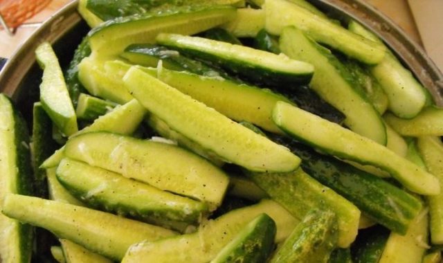 Cada pepino se corta en 6-8 partes iguales. Deben mezclarse con ajo, pimienta, sal y cilantro molido. Se agregan azúcar, aceite de girasol y vinagre al mismo recipiente. La masa resultante de pepinos se deja durante 3-4 horas para que se libere una cantidad suficiente de jugo.