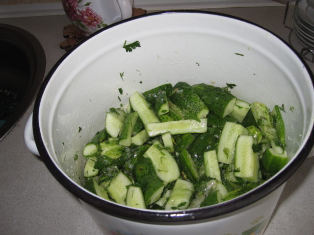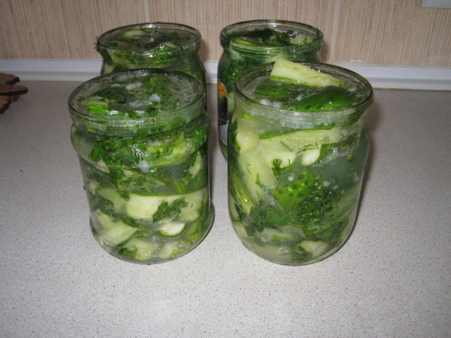 Todos los ingredientes se mezclan bien y se dejan 3 horas para que suelten el líquido. Pasado este tiempo, los pepinos se sacan y se colocan en frascos. El adobo restante se sala al gusto y se vierte en la ensalada terminada. Después de eso, los frascos se esterilizan durante ¼ de hora en agua hirviendo, luego se sellan con tapas y se envían para su almacenamiento hasta el invierno.