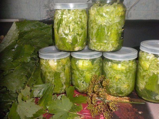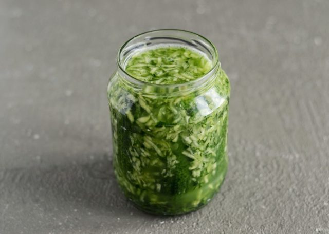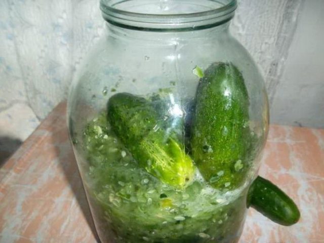 En este momento, se prepara la marinada. Usando un procesador de alimentos, las verduras grandes se trituran hasta que estén blandas, luego se les agrega sal, vinagre y azúcar. La masa resultante se hierve durante 4 minutos, luego se vierte en un recipiente con pepinos. Las latas de bocadillos se enrollan y almacenan.