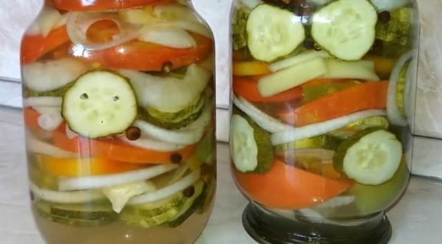 Las verduras se lavan suavemente y se cortan en círculos. Pelar las cebollas y cortarlas en medias anillas gruesas. Las verduras se colocan en un recipiente hondo, se les agregan otros ingredientes y se dejan en esta forma durante 2 horas, a veces revolviendo toda la masa. Durante este tiempo, de ellos saldrá una cantidad suficiente de jugo para una mayor conservación.