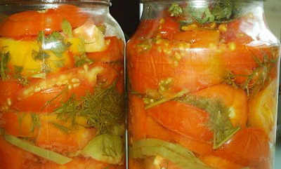 - Los tomates fuertes se cortan en rodajas y se colocan en frascos limpios y secos, dejando algo de espacio para los pimientos.