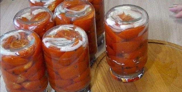 De acuerdo con esta receta, los tomates en rodajas con cebolla se preparan de manera tan simple para el invierno que incluso el ama de casa más inexperto puede manejar el proceso.