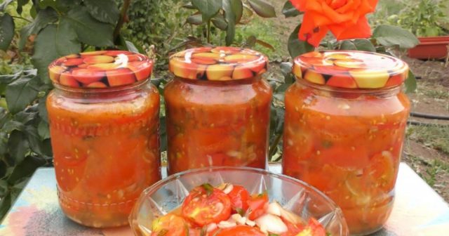 Los tomates cocidos de acuerdo con esta receta tienen un sabor muy atractivo debido a la adición simultánea de cebollas, ajo y aceite vegetal. Así que el nombre de la receta de tomates picados "lame los dedos" está bastante justificado y suena especialmente atractivo en invierno cuando faltan las vitaminas naturales.