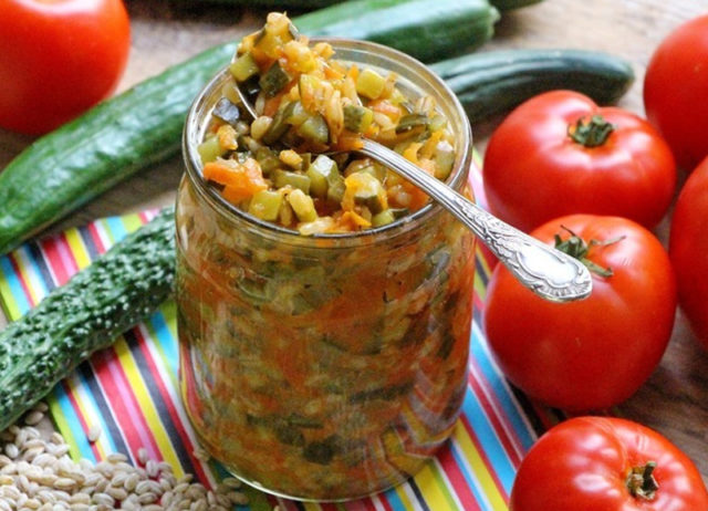 Encurtido para el invierno con cebada, pepinos frescos y tomates