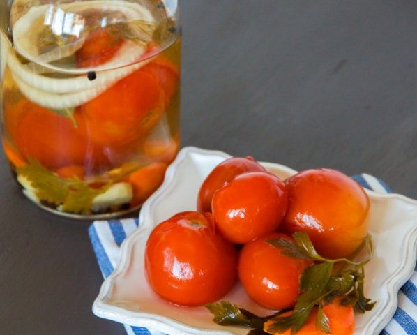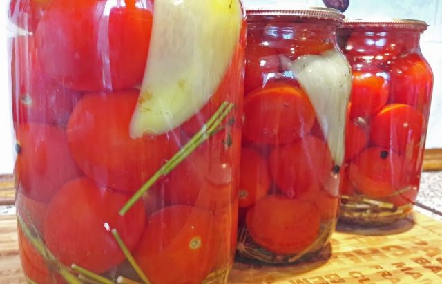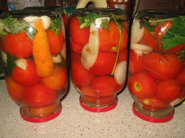 Esta receta se puede llamar clásica. Es mejor llevarle tomates carnosos y un recipiente de tres litros. Puede comer cebollas y zanahorias de un frasco, pero no debe beber salmuera. Y para personas con enfermedades del estómago e intestinos, está contraindicado.