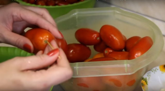- Los tomates limpios se pinchan con un palillo en la zona del tallo.