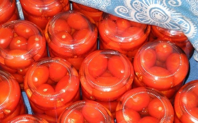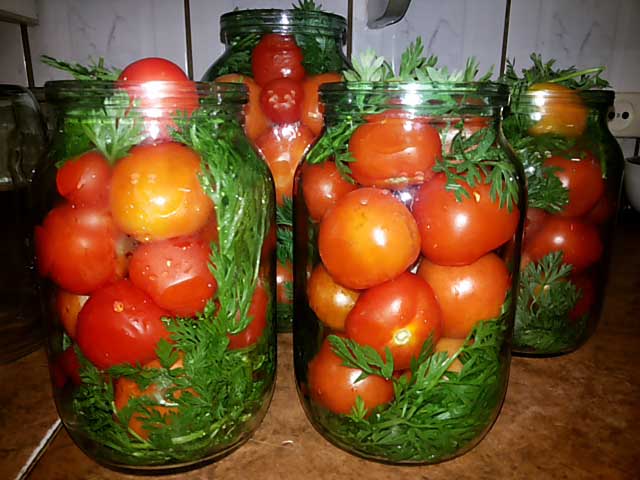 - Los tomates se colocan en frascos estériles, se vierten con agua hirviendo, se cubren con una tapa y se dejan reposar durante 20 minutos.