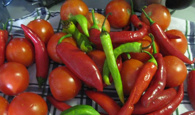 - Se quitan los tallos de los tomates, se deja intacto el pimiento. Los frutos están bien lavados.