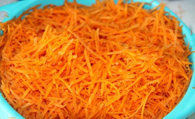 Las zanahorias se cortan en un rallador especial de estilo coreano o se cortan en tiras.