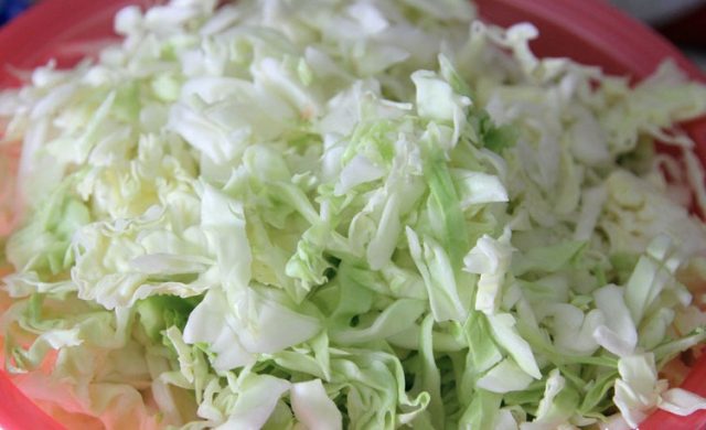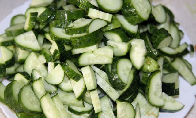 Corta los pepinos por la mitad y córtalos en tiras finas o semicírculos. Pique el repollo en tiras, puede usar un rallador especial. Arruga ligeramente con las manos para que suelte el jugo.