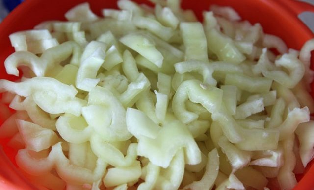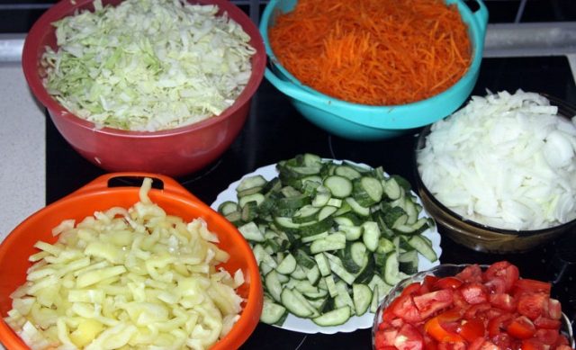 Puedes cortarlo como te diga tu imaginación, pero por lo general hay un cierto estándar de preparación. Los tomates se cortan en cubos, las zanahorias se rallan. El repollo se pica como una ensalada. Cortar el pimiento y la cebolla en mitades de aros. Corta los pepinos en rodajas y mitades.