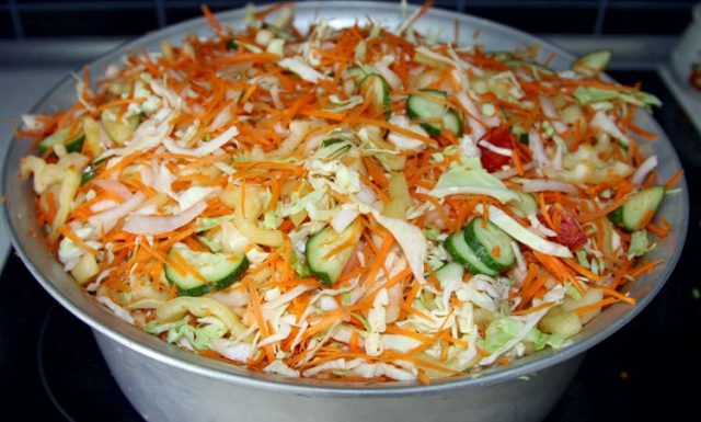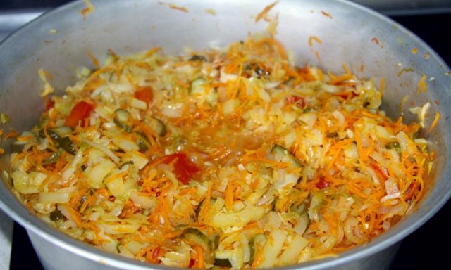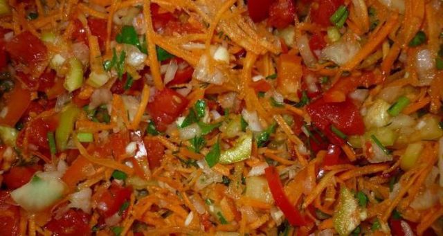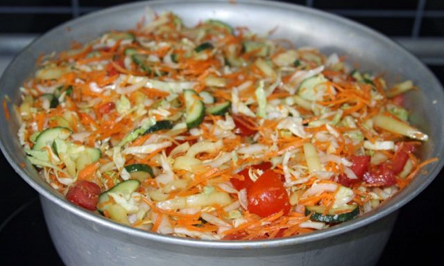 Transfiera todas las verduras a una sartén esmaltada y mezcle bien, sin usar fuerza. Agrega sal, especias al gusto, vinagre, aceite y vuelve a mezclar. Déjelo reposar durante 2 horas.