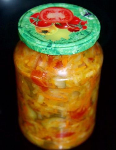 Ponga la cacerola a fuego lento y deje hervir. Hervir la merienda durante 10 minutos. Luego, transfiera la ensalada a frascos listos para usar y apriete bien las tapas. Voltea los bancos y envuélvelos en una manta.