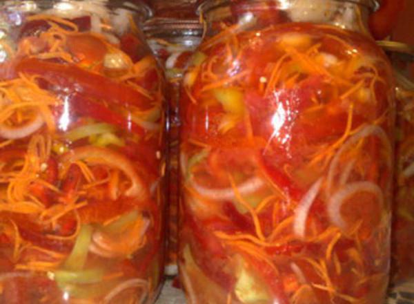 Pimienta para quitar semillas y particiones. Cortar a lo largo en varios trozos y cortar en trozos pequeños. No triture muy finamente. Ralle las zanahorias en un rallador fino o use un estilo coreano especial para las zanahorias. Pica la cebolla en mitades. Corta los tomates en trozos pequeños.