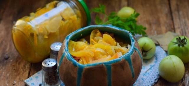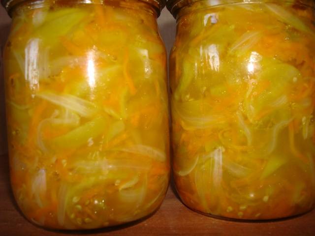 En esta composición, después de mezclar a fondo, las verduras se dejan durante media hora, después de lo cual se colocan a fuego muy lento, en el que se llevan lentamente a ebullición. La ebullición no dura más de 5 minutos, y la ensalada se coloca inmediatamente en pequeños frascos estériles preparados, se cierra herméticamente y, cuando se pone boca abajo, se deja enfriar debajo de una manta durante al menos 24 horas.