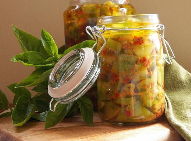 - Las verduras se vierten con la marinada y los frascos se dejan pasteurizar durante 10 minutos en una cacerola con agua hirviendo.