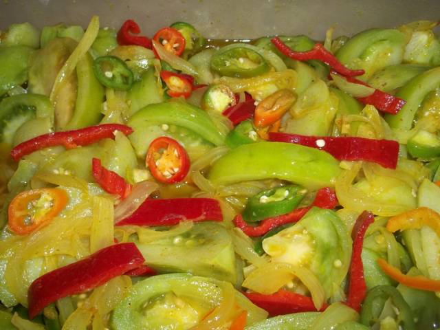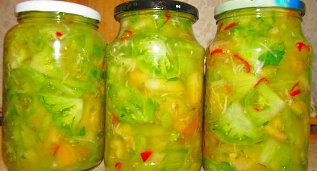 Cocinar ensalada de tomate verde con pimienta para el invierno en el siguiente orden: