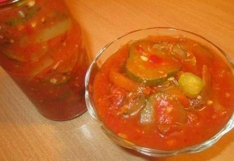 Tome una cacerola grande con un fondo grueso, vierta la pasta de tomate, que se diluye en medio litro de agua. Luego ponga pimientos picados, zanahorias, pimientos picantes, ajo, aceite, sal y azúcar en el mismo lugar. Mezclar todo bien y agregar pepinos por encima.