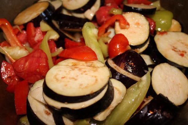- Preparadas y cortadas, como se mencionó anteriormente, poner las verduras en un recipiente hondo de acero inoxidable o esmaltado. Agregue aceite vegetal, revuelva.