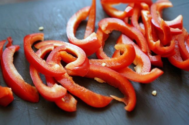 Los pimientos de cualquier color son aptos para cocinar. Es más sabroso con frutos de paredes gruesas. La ensalada resulta abundante, rica y nutritiva. Sírvelo con guarnición o con pan blanco.