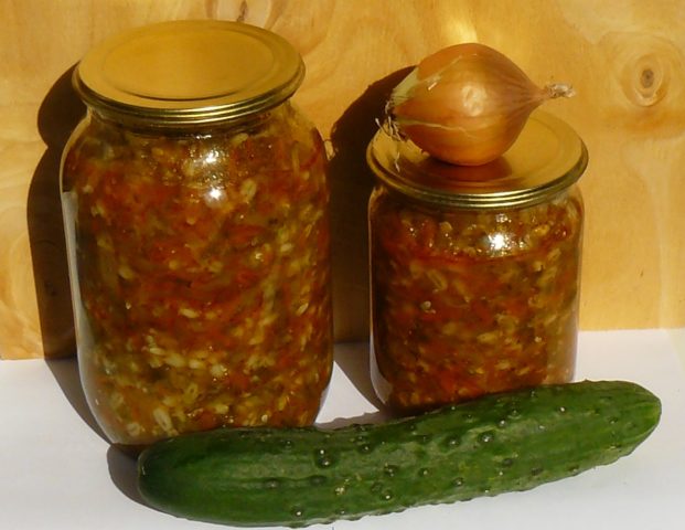 La preparación casera es adecuada para usar como un refrigerio independiente, aditivo para otros platos, aderezo para encurtidos. La solyanka de pepino para el invierno de acuerdo con esta receta se hace sin repollo, pero con la adición de cereales.