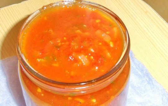 Por cierto, la salsa de tomate picante se prepara utilizando exactamente la misma tecnología. Para que finalmente conquistó con su vigoroso sabor a los amantes de todo lo picante, solo necesita agregar 3-4 vainas de pimiento picante y ciertamente rojo en lugar de uno. Porque es el rojo el más picante. Y si agrega algunas raíces de rábano picante a los ingredientes, tanto el sabor como el aroma serán más que dignos.