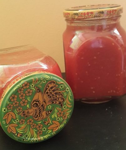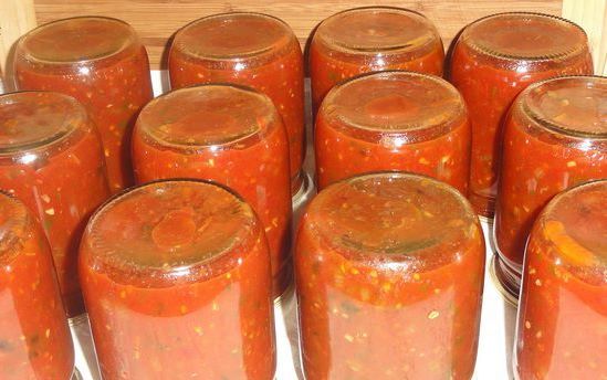 - Para conservar en invierno, la salsa de tomate se vierte en latas de 0,5 litros, se esteriliza en agua hirviendo durante unos 15 minutos y se enrolla.