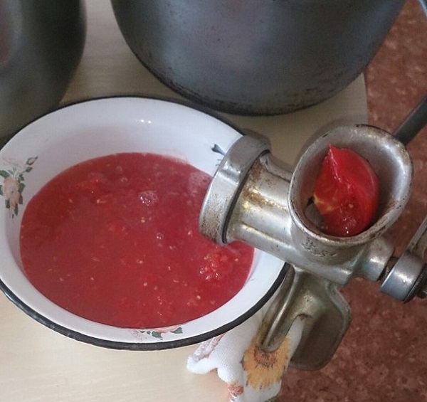 - O use el método manual, en el que los tomates, cortados en rodajas, se calientan primero bajo una tapa en cualquier recipiente conveniente. Y luego se frotan a través de un colador, eliminando las semillas y los restos de la piel.