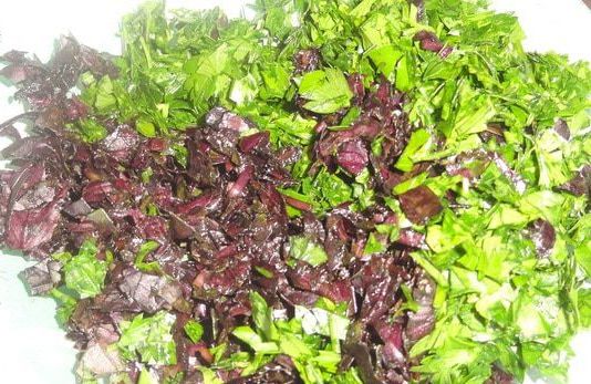 - Las cebollas verdes, el perejil se cortan en trozos pequeños y se envían allí.