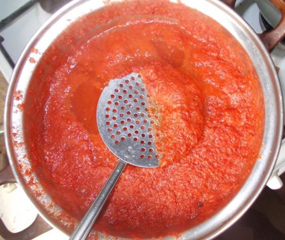 - Los tomates se pelan, se pasan a una cacerola y se hierven hasta obtener una masa líquida homogénea.