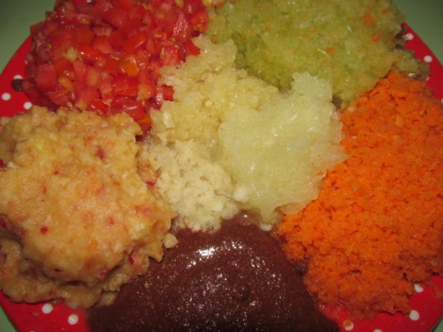 - Luego, después de cortarlos en trozos pequeños, muele cada verdura a través de una picadora de carne en un recipiente separado.