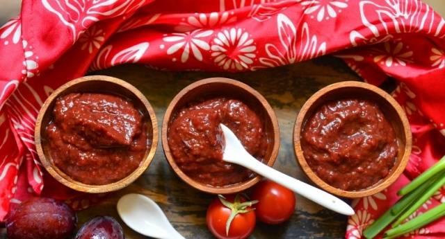 - Luego agregue el puré de ciruelas, el azúcar, la sal y cocine a fuego lento durante otros 30 minutos. La salsa picante para el invierno se coloca en frascos preparados y se enrolla. Lo enviamos al revés debajo de un abrigo de piel por un día.