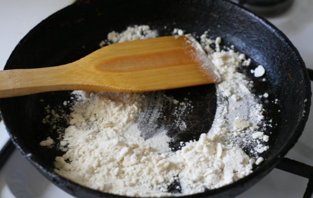 - Preparar la base para la salsa de trufa - harina frita con grasa. Después de calentar, la harina cambia su olor a un agradable aroma a nuez. Debe mantenerse al fuego durante 3-4 minutos hasta que el color comience a cambiar.