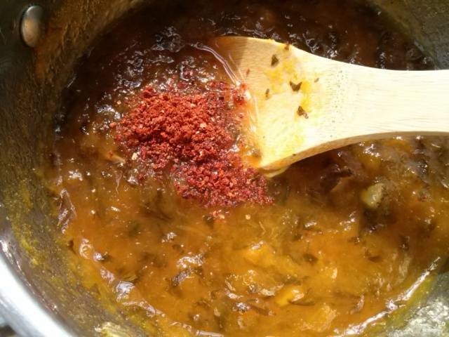 - Toda la salsa picante se cuece a fuego lento durante unos 15 minutos, revolviendo continuamente con una cuchara.