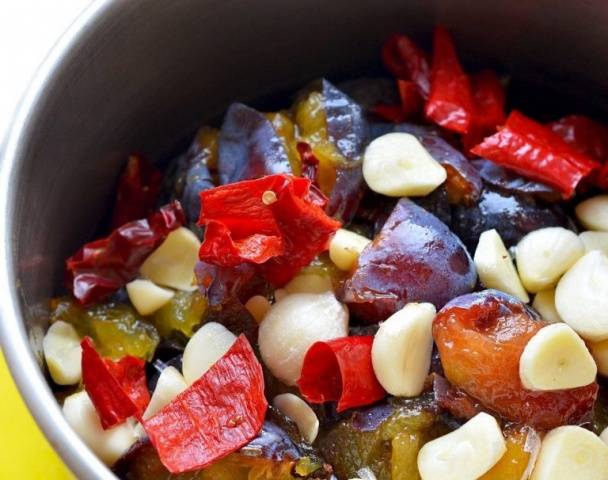 Primero, las ciruelas deben lavarse, cambiando el agua para limpiar varias veces. Ahora se quitan las semillas de las ciruelas y se pela el ajo de la cáscara. Las rodajas de ciruela junto con el ajo se pasan a través de una picadora de carne.