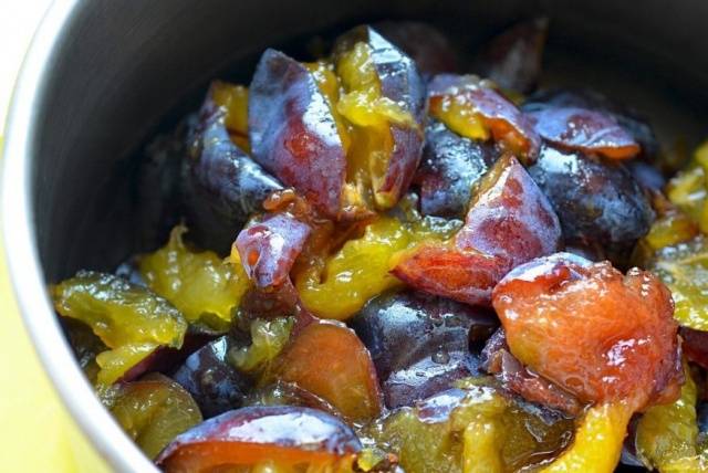 - La ciruela se debe lavar y poner en una cacerola. Agregue medio vaso de agua allí, prenda fuego. Cocine a fuego lento hasta que la cáscara comience a separarse de las ciruelas.