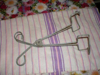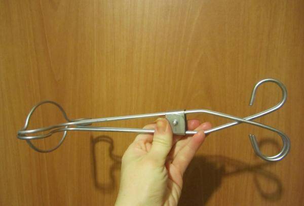 Suelen ser dos partes de metal ligero que se cruzan a modo de tijeras, de unos 25-30 cm de largo, cada una de las cuales tiene en un lado asas en forma de anillas, a modo de tijeras. En el otro lado de cada pieza, la parte metálica está doblada en forma de medio anillo. Cuando están conectados, forman una forma de cuello muy conveniente, con la ayuda de la cual puede agarrar de manera simple y segura la parte superior del frasco y sacarlo tanto vacío como lleno de agua hirviendo.