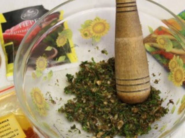 - En un recipiente hondo de porcelana, mezcle los lúpulos suneli con cilantro molido y ají picante. Agregue las especias a su vez.